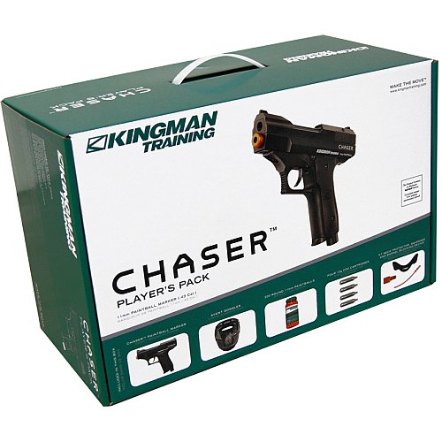 The Kingman® Training Chaser™ player's pack comes complete with a Chaser™ marker, goggles, paintballs, CO2 cartridges, a neck protector, a barrel-blocking device and squeegee.
